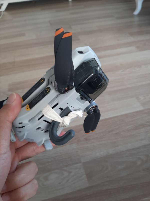 Системы штатной не было, на скорую руку собрал подвес: пластиковый крючок, двусторонний скотч, текстильная лента. В полёте сдаю назад - снасть отщёлкивается. Морская рыбалка в Аланье плюс дрон - удобно.