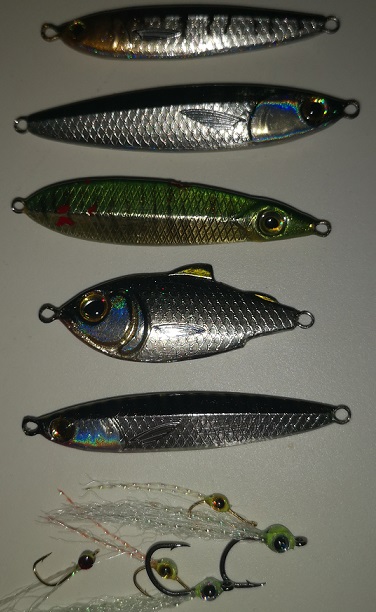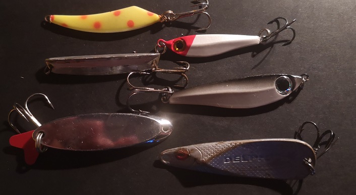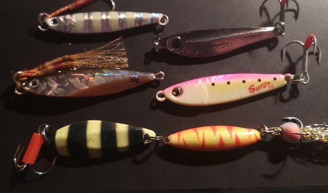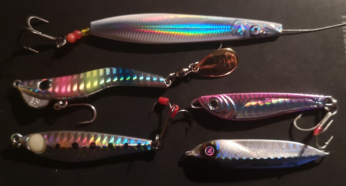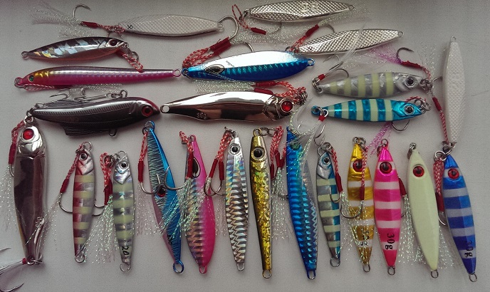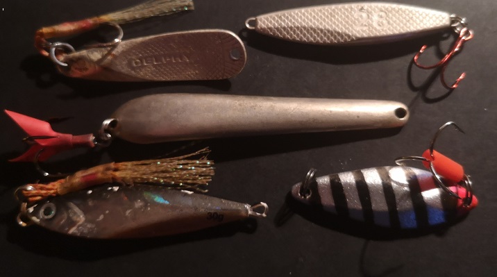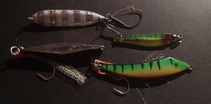 У меня пилькеры живут плохо по двум причинам: камни на дне и ночные подъёмы с трёх-четырёх метров, приманка бьётся о валуны. Думал, что у железа игры нет, ловил китайцами, но «родные» свою игру имеют и ловят лучше. Названий не запоминаю, а в этом году любые приманки работают так себе. Набор на фотках, далеко не полный.