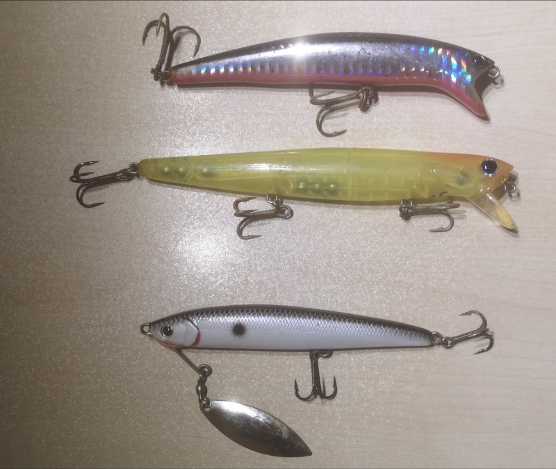 Копался в коробках при «неводе», нашел пару неразловленных. Верхние два - воблеропопперы, нижний - тонущий с лепестком. Кто гонял такие в море? Попперы летом, когда тепло и тихо, должны зайти. А низ можно и сейчас прокатать. F-Tec s-four, Hump gus 125F, LC blade cross 90S.