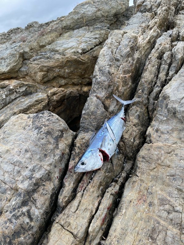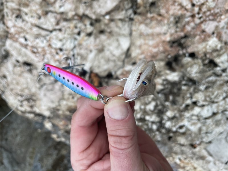 Из-за дождей сместились на поиск новых точек, чтобы по мокрым скалам не карабкаться. Нашли галечный пляж с выходом породы сбоку, глубина у кромки 5–6 м, сорокаграммовый пилькер падает секунд семь. На чистом — ноль, на камнях хищник держится. Местный у края бухты на розовый полосатый Savage 20 г взял два тунчика и луфаря под три кило. У меня — один тунчик и пять ящериц, раньше их вообще не ловил. Недалеко у берега кто-то гонял летучек. Морская рыбалка на галечном пляже Анталии иногда дарит тунчика прямо у кромки.