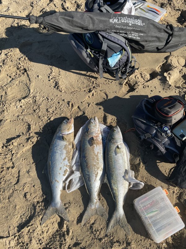 Забыли дома ручку от твина - ловили по очереди на один спиннинг)). Уровень воды поднялся; там, где была коса, гуляют луфари. В волне группами по 5-8, крупняк 5+ ходит отдельно. Клев начался, когда солнце полностью вышло. Каждый уговорил по три. Работали топвотеры, на воблер и резину - по одной пустой поклёвке.