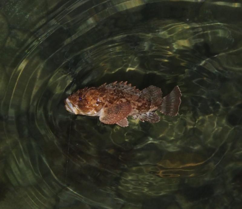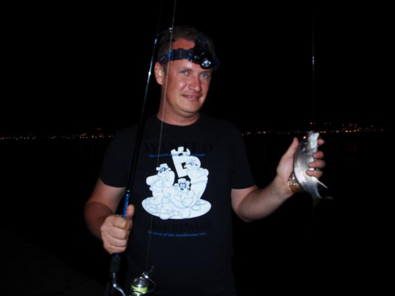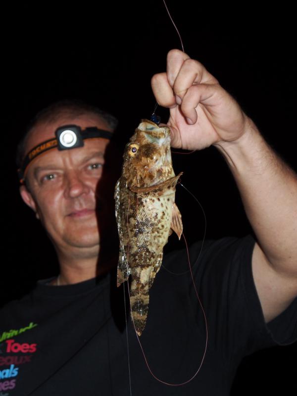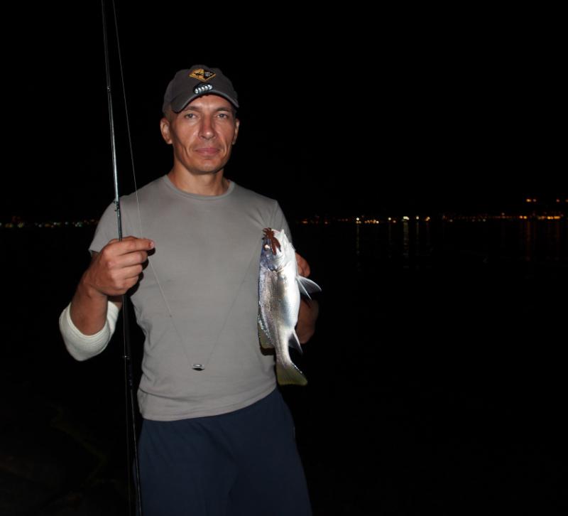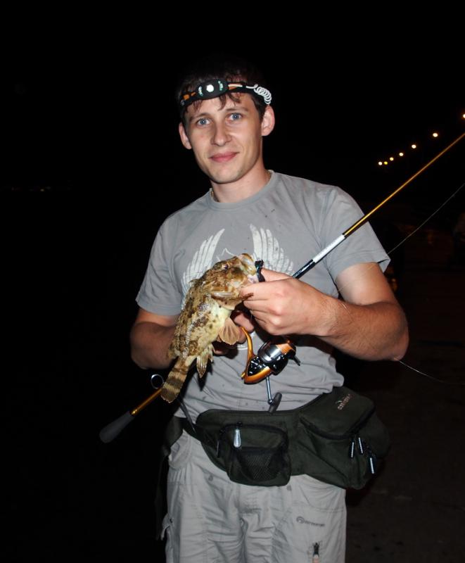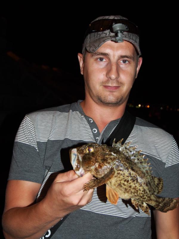 Старт в 19:00, Бухта — штиль. Днем карась от «пятачка» до «лаптя», в прилове барабулька. Ночью вышла скорпена, работает разная резина, в том числе плавающие червячки FS 303. Луна «стареет» — клев есть. Компания — огонь. Морская рыбалка в Новороссийске зашла.