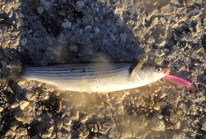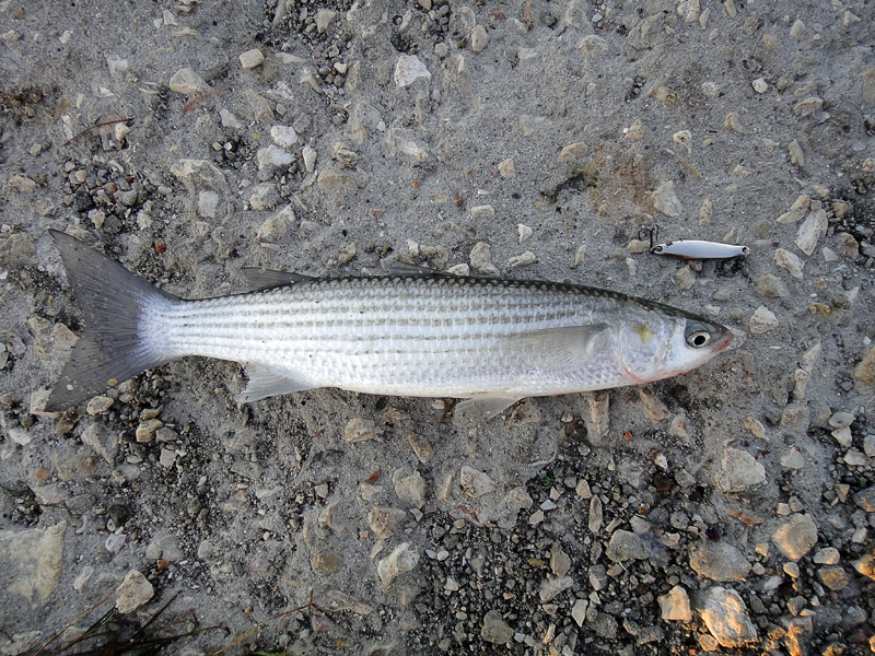 Поймал несколько кефалек на колебалки. Для меня неожиданно, но факт. Оснастка отработала в прибое.