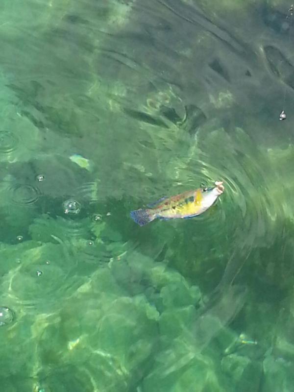 Гладь, жара, вода прозрачная. На креветку с пирса — зелёнушка, скорпена, ласкирь. Много холостых, мелочь дразнит. Крючок №8 Owner с длинным цевьём.