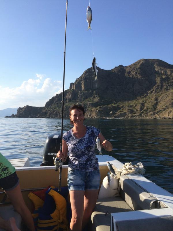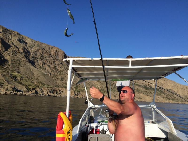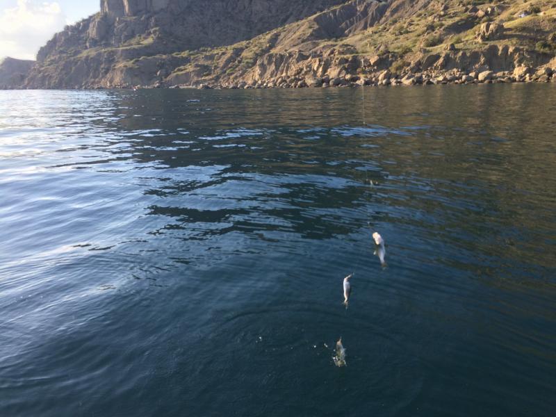 Первая черноморская рыбалка под Судаком: на самодур с пустыми крючками и микрокреветкой — луфарь активно. За 1,5 часа набили ведро, рыба вкусная, чистки почти не требует.
