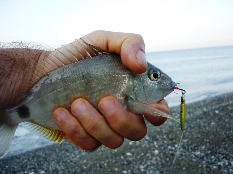 Первая утренняя скука сменилась темпом: карась с рассвета на каждой проводке. Эффективная проводка пилькером 4 г — два подрыва по 30 см, оборот скоростной катушки, пауза. Неожиданный мощный любитель лиманного червя на пилькер — бег по двум волнорезам, попытка завести в волну. Вечером была ставридка, но снасть запутал. Морская рыбалка в Багрипше бодрит.