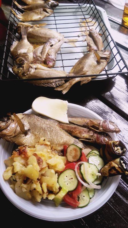 Первую ночь ставридка под луной, «Гравити» отработал. Потом планировали горбыля с лодки на краба, но волна разогнала — ловили с берега, одного взяли у скалы. Карасей закоптили, на пляже вечером барабулька слабо. Уха из карася, барабульки, скорпены, горбыля и ставриды удалась. Форель на горной реке сорвалась из-за ливня.