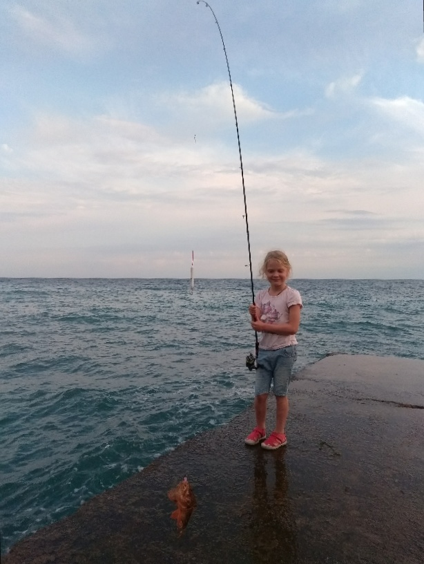 Дочку натренировал забросу — теперь ловит почти сама. Сначала пилькер, потом силикон, поплавок знаком. «Спортсменка, комсомолка!» 7 лет.