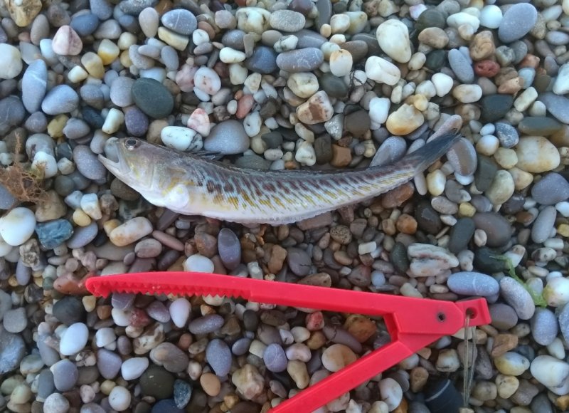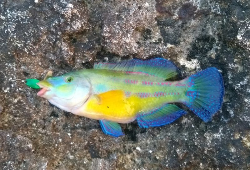 Потяжка, зацеп, кто-то выбирает шнур. Обошёл бухточку туда-сюда, камни острые, местами по колено. Уже собрался плыть — и спиннинг «побежал», рыба выплыла. Ранее на песке «мокрая тряпочка» — дракончик. Он сорвался и прыгнул мне на ногу выше колена. Акробатика получилась, понимаю, почему местные бьют дракошу тапком.