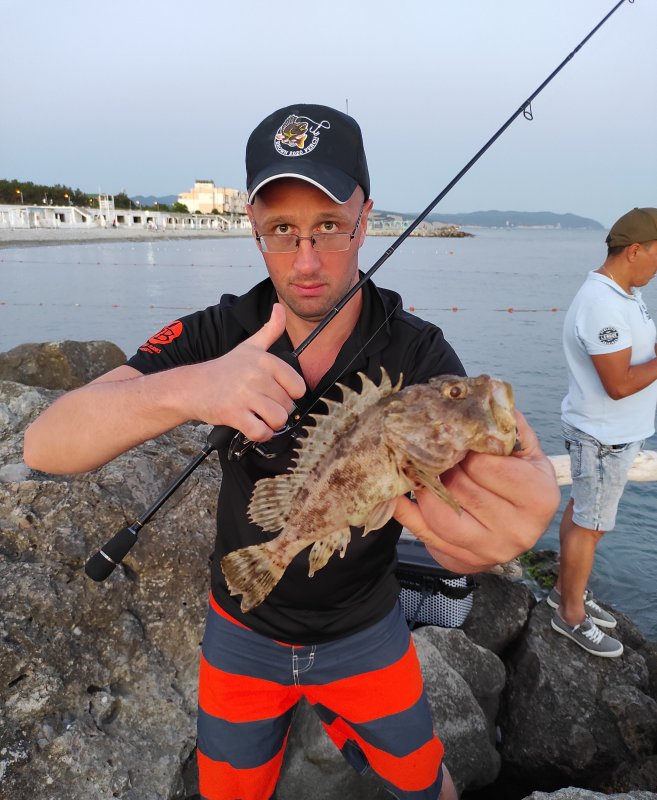 Карась безнаказанно сдирал Marukyu. Солнце тонет — подошла скорпена, поклёвки злые. У одной в пасти живой краб, не захотел вылезать из ловушки.