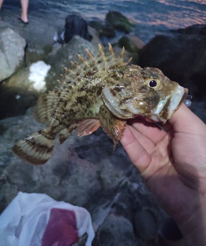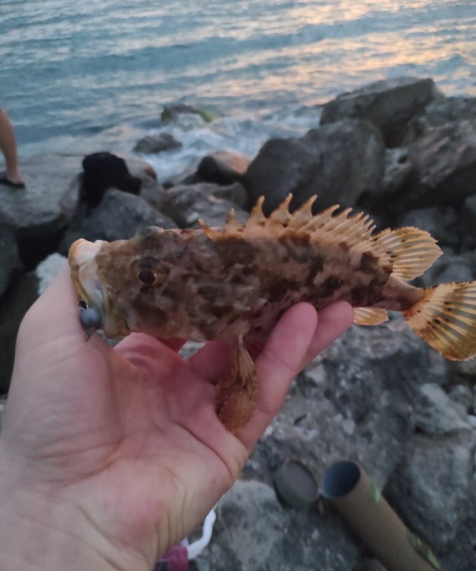 Волна поднялась, камни заливало. Поймал несколько скорпен, два крупных сфоткал, мелочь отпустил. Позвонили на шашлык и вино — пошёл.)