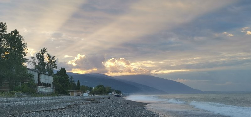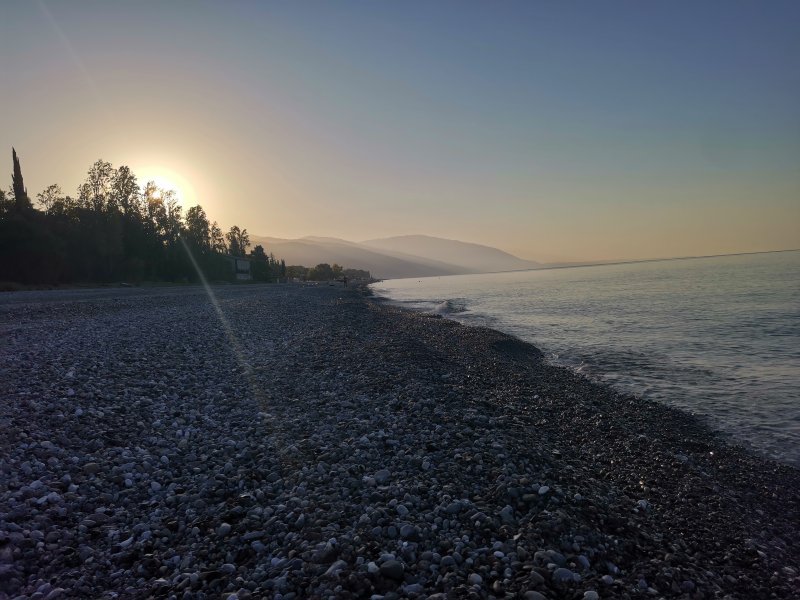 Абхазия, Цандрипш: штиль и жара, ноль ночью, рассветный луфарь устроил праздник