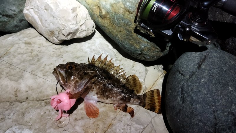 Дождь тянулся до позднего вечера. Для дальности ставил две «тирольки» по 5 г, ловил «издалека». Ночью уговорил одну скорпену. Утром — те же редкие подбои, снова одна. Зато видел дельфинов. Морская рыбалка в Имеретинке с характером.
