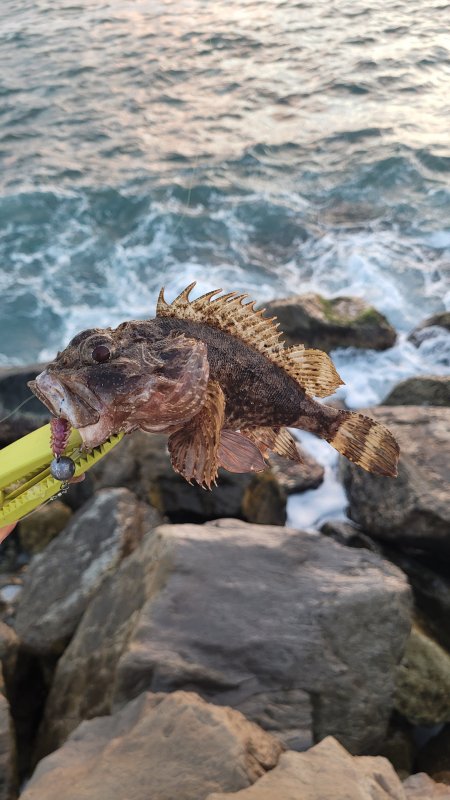 Начал с 4 г и маракью, но прибой сдул всё. Перешёл на 6 г и червя на офсете — взял ласкиря, потом упитанную скорпену. После обрыва поставил стрейч-креатуру — ещё одна скорпена. Морская рыбалка в Имеретинке — точка держит.