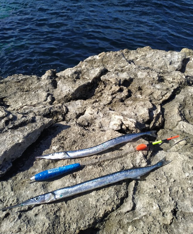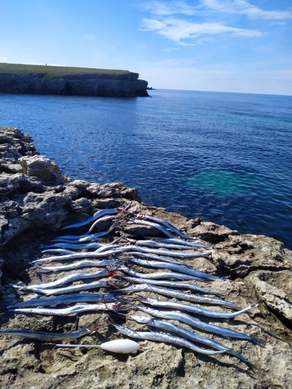 С 7:15 на скалах, сначала 35 г, потом 20 г бомбарда. Поплавки полетели и видны отлично. Итог — 27 на бомбарду и 2 на поплавок. Один сарган ушёл девушке на фотосессию.