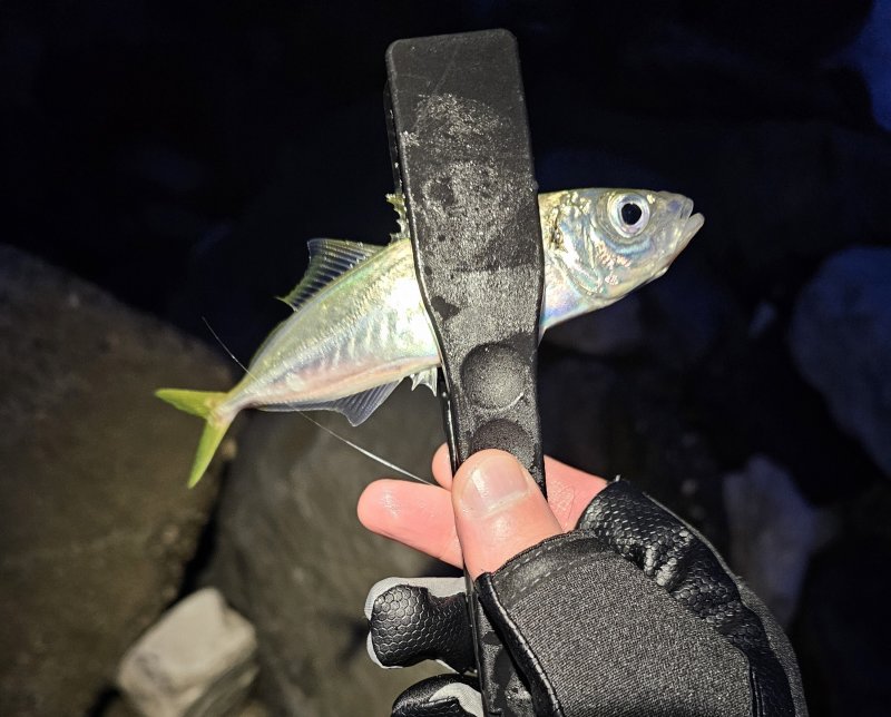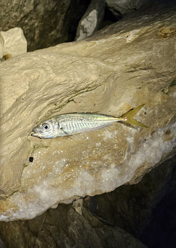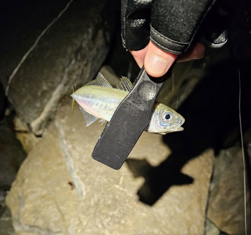 Безветренно, но море катило. С верхатуры камней проводка получалась. К сумеркам ставрида встала плотно — поклёвка почти в проводку, реализация страдала. Через час выключило.