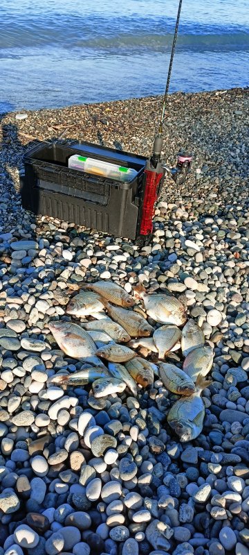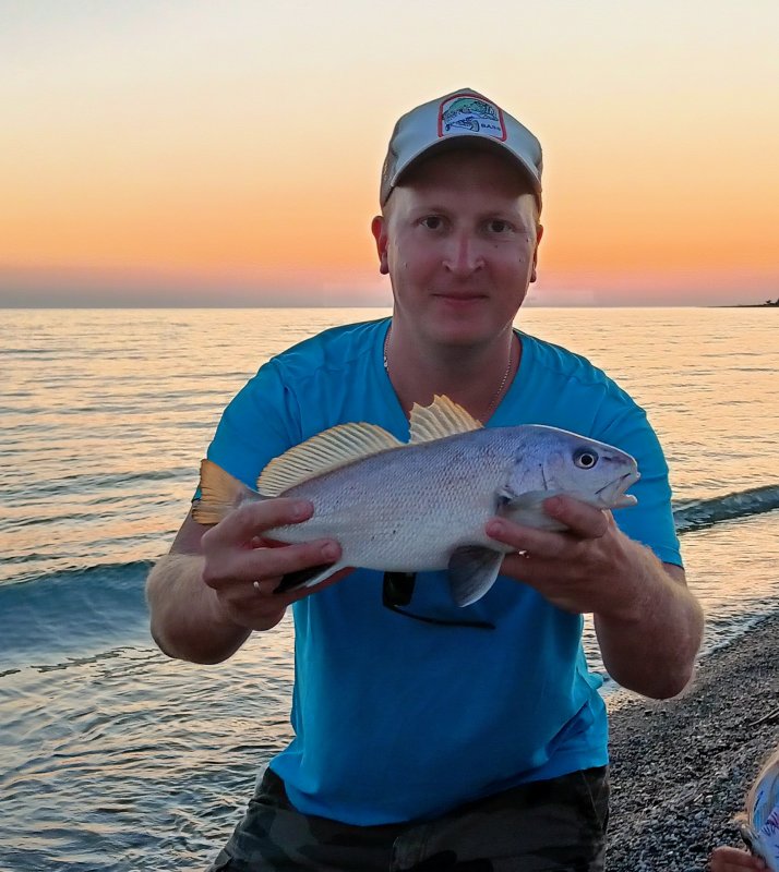 Пицунда: час вечером — ~5 карасей и горбыль 700 г. Утром 5:30–7:30 клев средний, равномерный, карась мерный. Морская рыбалка в Пицунде стабильна по кромке.