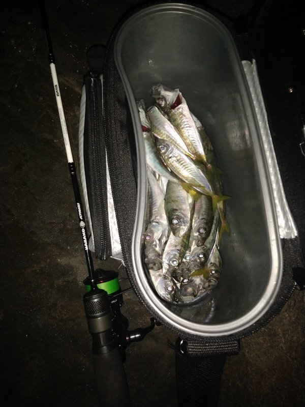 Нижняя Хобза, второй волнорез. Ветер сменился, волна спала — с 22:00 ставрида пошла массой, много 10+. За ~2 часа почти полкана, около 15 штук сорвал при подъёме без подсака. Груз 0,7 г, проводка деликатная.