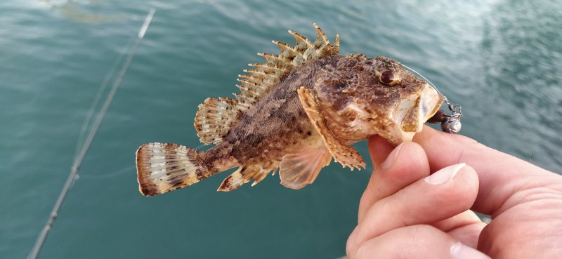 Ловил у Sea Galaxy и слева от «КИТа». По приманкам — Лаки Джон розовый/сиреневый и Polaris белый/кислотно-зелёный. Попалась мелкая ставрида, приятный горбыль и «пузатая» скорпена.