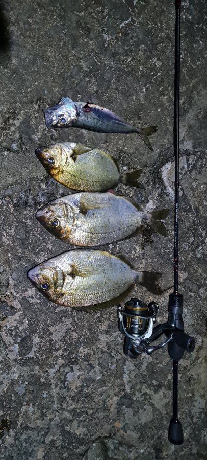 К 21:00 пошли ерши и бычок, в 23:00 первый карась, дальше ставрида потолстела. Обрыбил новую палочку Nano One Long SE, бомбарда 5 г самодельная, насадка маракуйя.