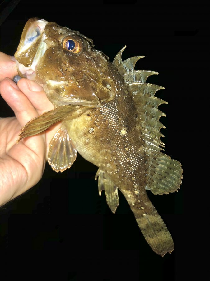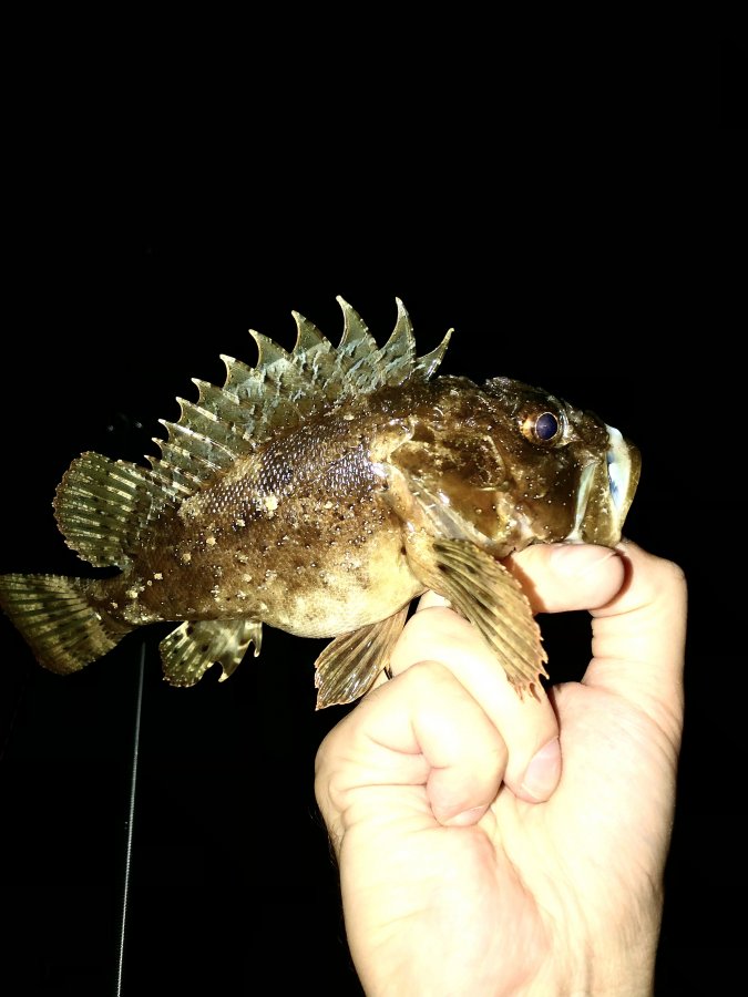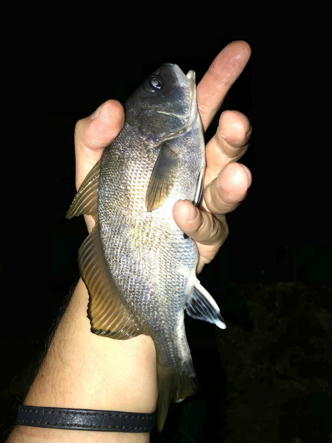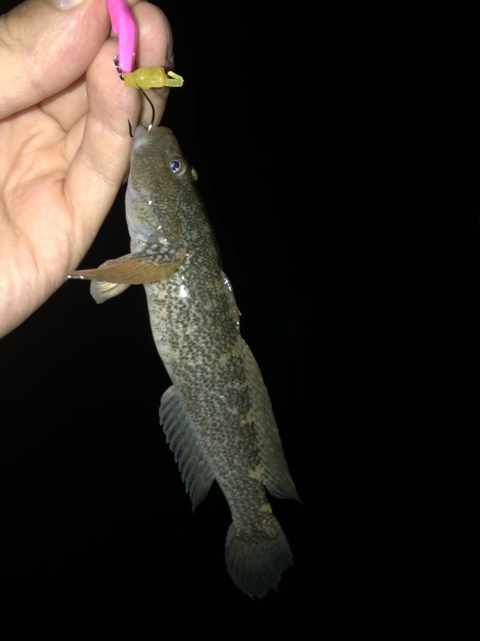 Микроджиг и обычная резина. Фонарик забыли — вываживал «на слух». Пару хороших сходов у кромки, вид не определил.