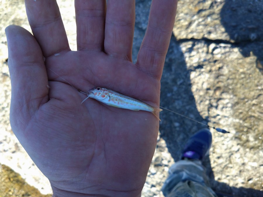Красных червей не достал. Барабулька держалась на выбросе и была совсем мелкая — отпускал. На сухого червя брала хуже. Два часа пролетели мгновенно.