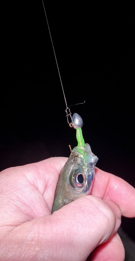 С 00:00 до 02:00 не выдержал холода — снялся. Утром карась взял на ставридный белый силикон, одиночный. Вода дышит холодом.