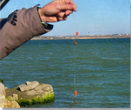 Фото пеленгаса и схема снасти: крючок торчит из красного пенопласта. Морская рыбалка в Бургасе по пеленгасу любит такие детали.