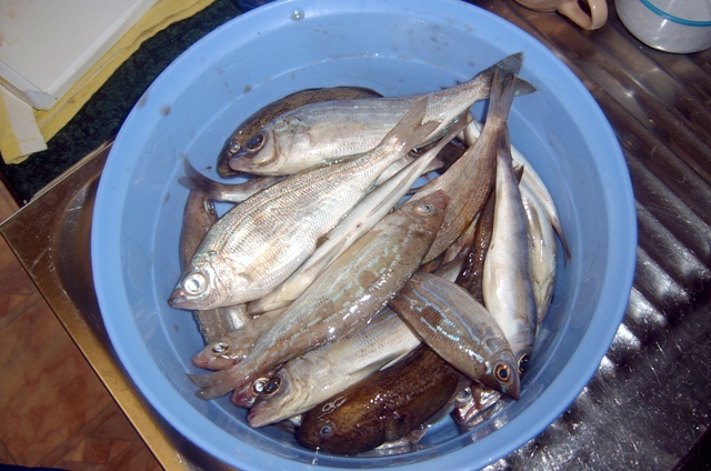 Выход по окуню: брало на креветку и куриное мясо. Улов достойный, сфоткали остатки.