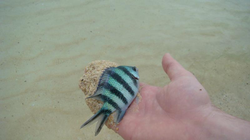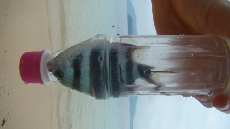 Жалел что без удочки, но извернулся. Пластиковая поллитровка, дно ракушкой отпилил, на рифе кормушки нет - засыпал хлеб и жду. Долго не пришлось - вся мелочь сама в бутылку зашла, сфотал и отпустил. Работает, если надо детей развлечь и руки чешутся.