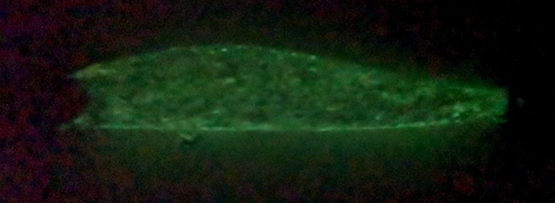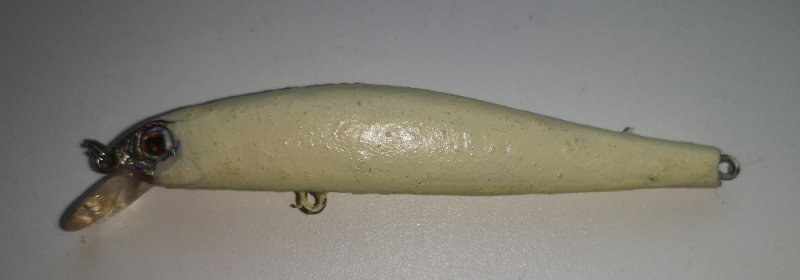 Смешал белый лак со светонакопителем — пошли комки. Всё равно перекрасил ещё один Ridge, пузо — слоями. Первая фотка ночью в туалете. Посмотрю реакцию. Морская рыбалка на Кипре любит светящиеся полосы.