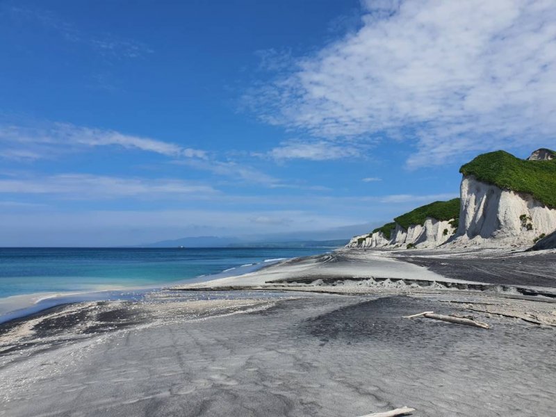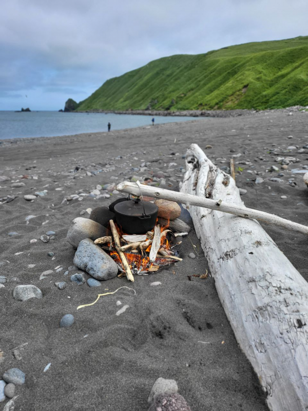 Семь утра — норм. Дороги: асфальт лишь местами, остальное щебёнка и пляж. Белые скалы и чёрный магнититовый песок — космос. Танковые башни на постаментах. Спрятанный водопад у стоянки рыбаков. До озера Сопочного по сопкам, но ловим в бухте рядом — морская рыбалка на Итурупе. Приманка — тасманский дьявол, розовый «ромб» с крыльями. Второй спиннинг — «крокодил». Первым делом поймал бычка с пастью-ведром, отпустил. Рыбинспекторы вежливо отодвинули нас от устья. Тандем Гайрат+сын взял горбушу и кунджу, я добрал горбушу через вывол с волной. Уха на костре вкусная, перца бы побольше. Ночью — землетрясение 5,5, рыба потом капризничала. План на океан формировали по высоте волны и туману. Ю-ху по пляжу на снегоболотоходе к Буревестнику. :)