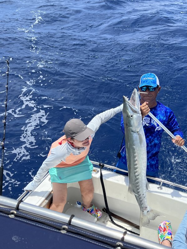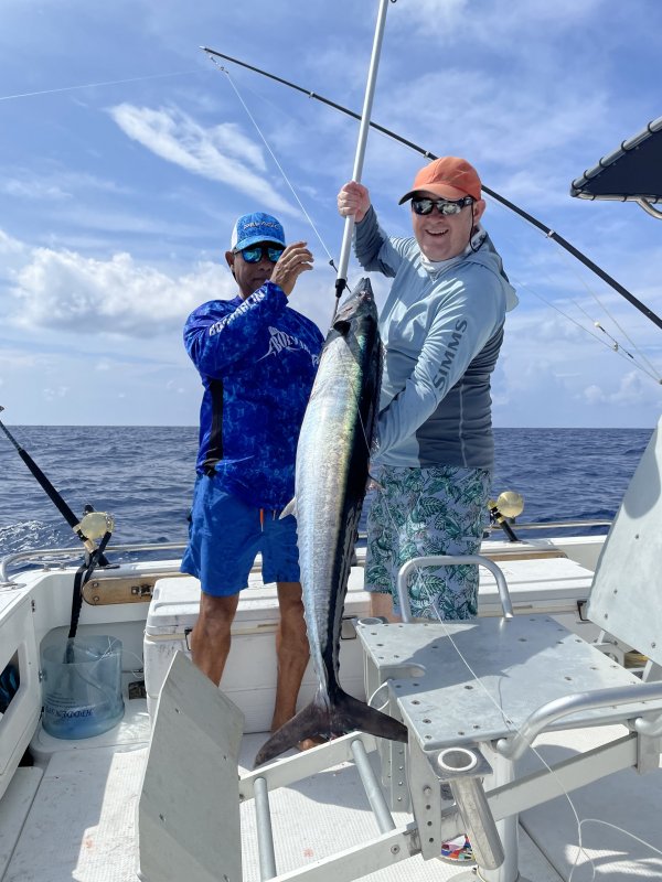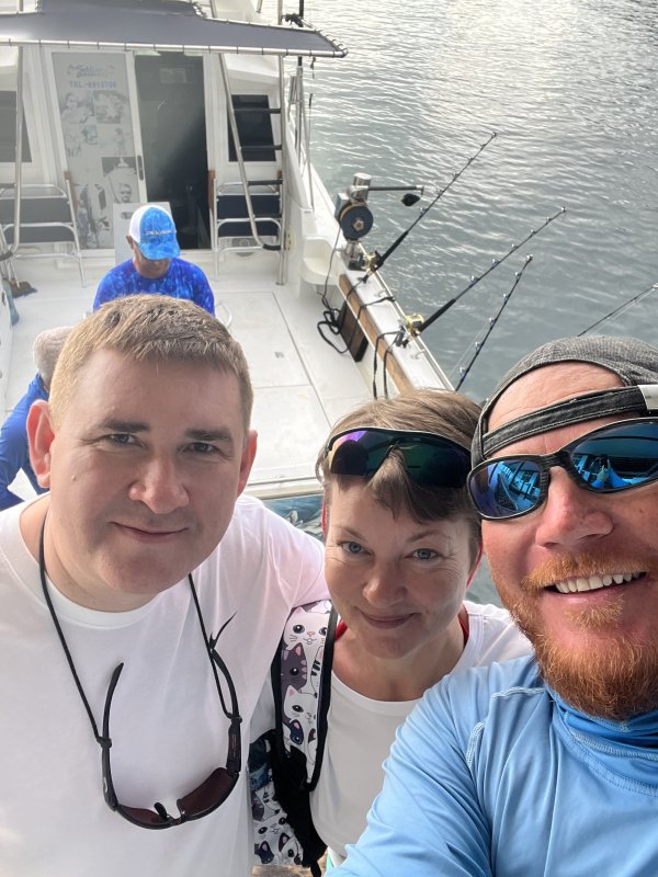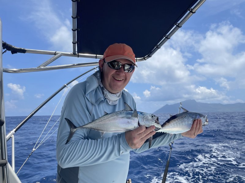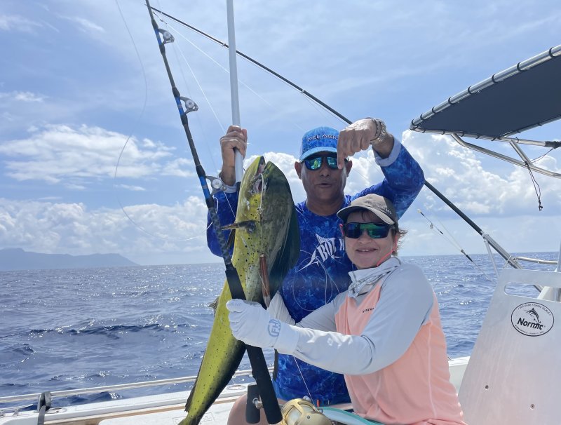 Гид Виктор Пепелин, капитан Кристофер (Тофер) и Льюис. Качка — тролль в приоритете. Птицы, котлы, но без тунца и парусника. В зачёте ваху, дорада, и барракуда 26 кг — выкачала сама. Обед — сашими. Морская рыбалка на Сейшелах зашла!