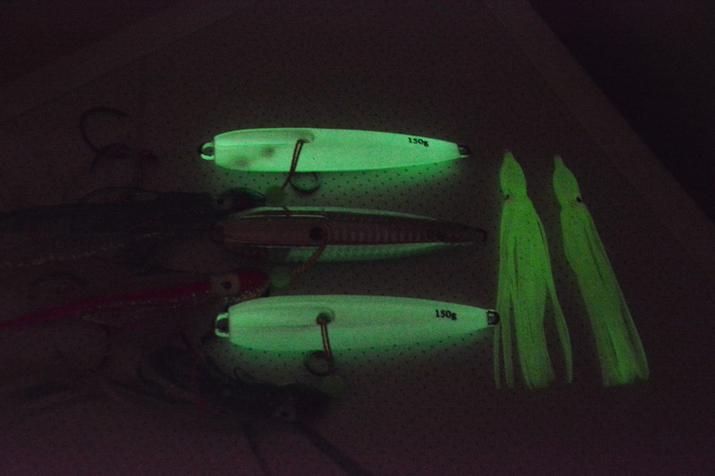 Взял светящихся осьминогов у mikeD — тест на ночи. По весу 150 г выбрал без опыта, советы из русскоязычного интернета редки. Будем дёргать по очереди, снасть одна на двоих — нарабатываем практику.