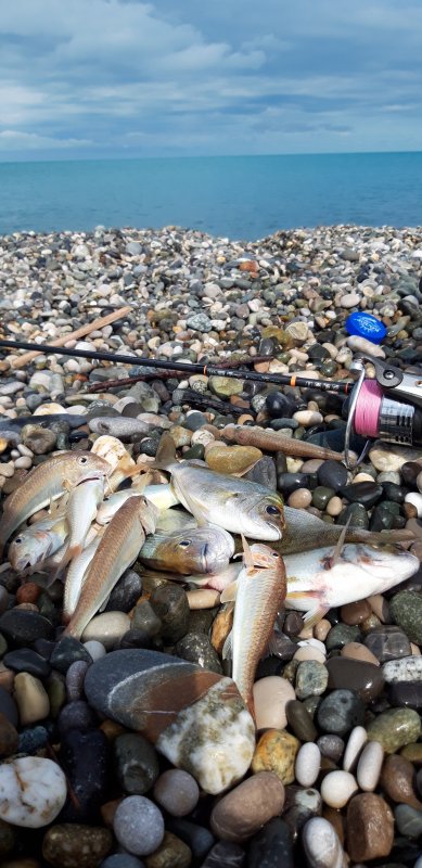 С раннего утра карасики и барабульки, затем сломался крючок — последний. Поездка за снастями в Гагры, потом волна прижала к берегу.