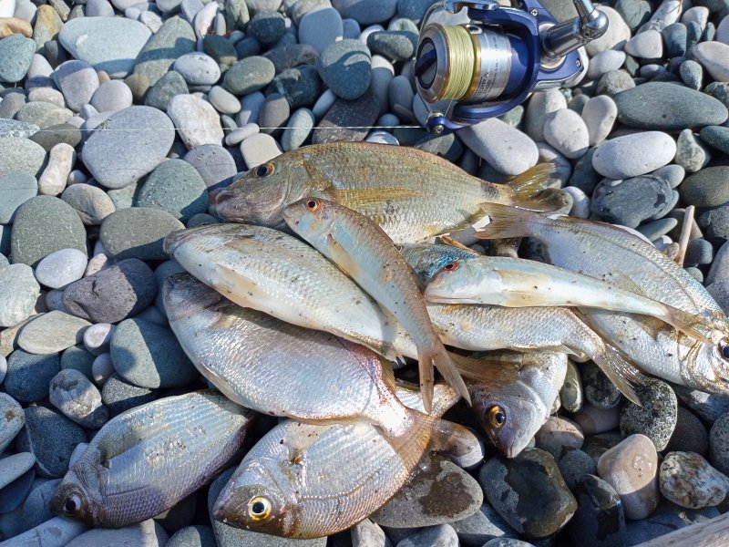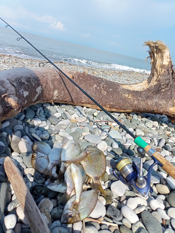 С 6 до 7 карась бодрил, потом час пауза, в 8 подошёл снова — ушёл на завтрак. Вода как зебра — тёплая и холодная слоями. Дельфины прыгают. Морская рыбалка в Абхазии радует.