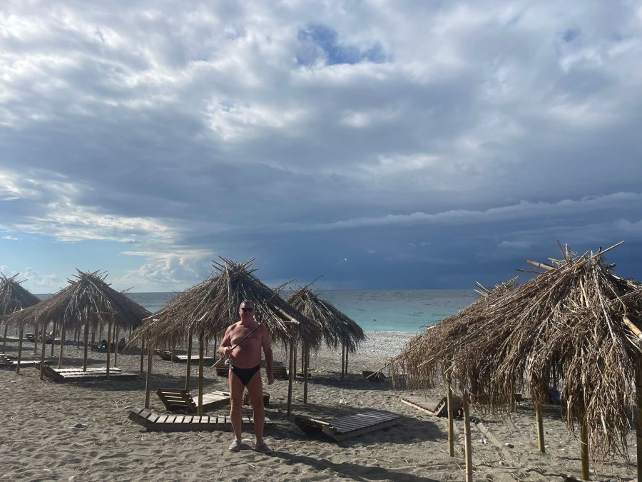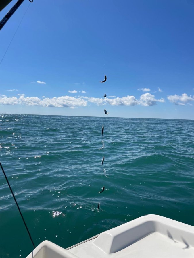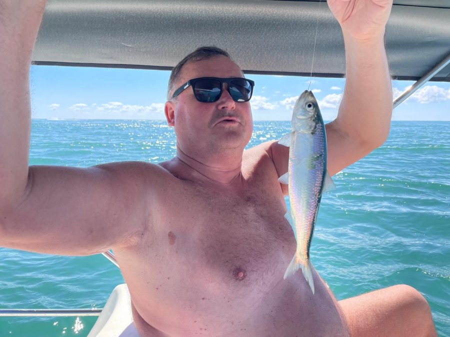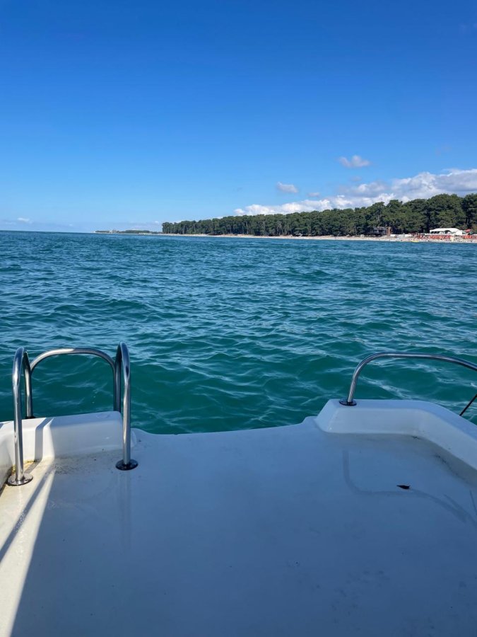 Купили местный самодур в Пицунде, за 1,5 часа на катамаране взяли ставриду, попалась селёдка. В кафе пожарили — пальчики оближешь. Погодка наладилась.