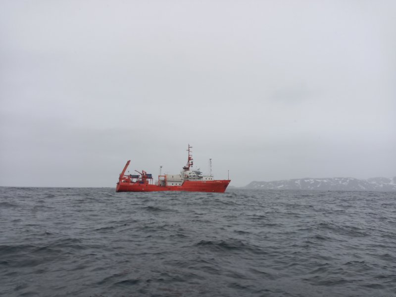 Каждый день судно становилось на проходе, глубины 40–70 м. Давленой мойвы полно. Похоже, ловит мойву. Место знакомо по лету.