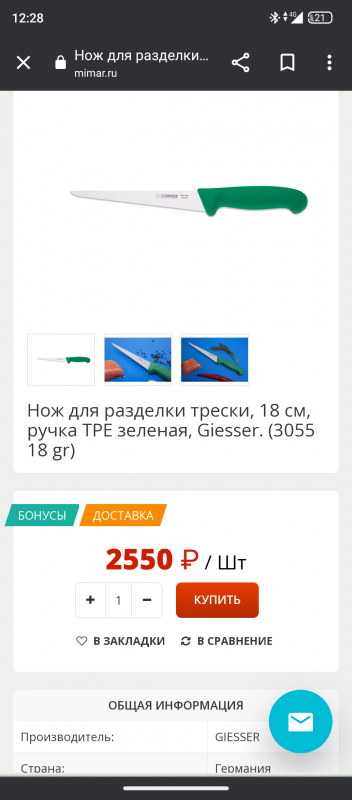 Взял нож «для трески» — удобно в руке, не скользит, лезвие жесткое. Весной в Териберке перешкерил до ~200 кг, головы режет хорошо, не точил ни разу. Дома тоже в ходу.