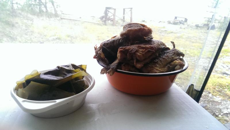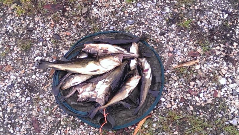 Стояли у старого парома со стороны Чкаловского. Дожди 10 из 11, но треску наелись. Камбала мелкая — отпускалась. Делали морскую капусту и варили мидии. Красота.