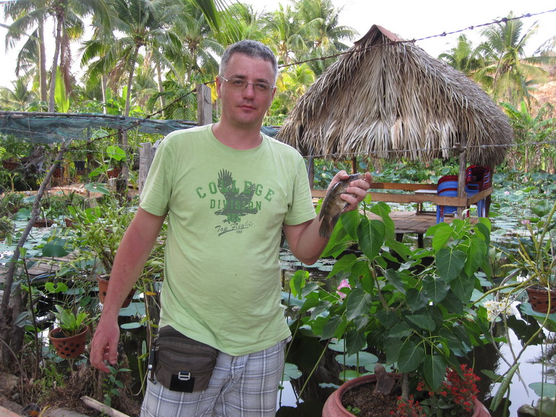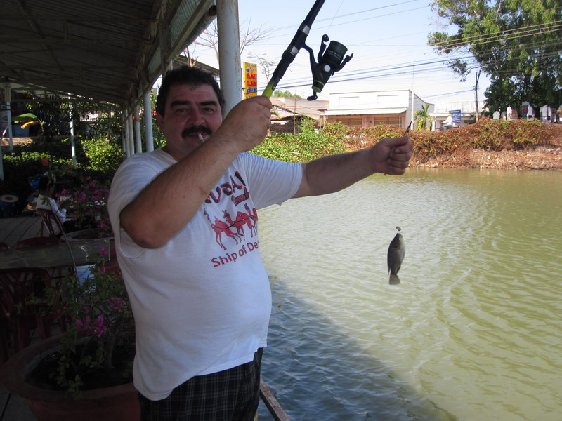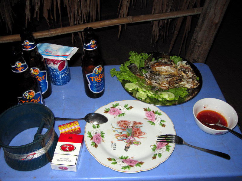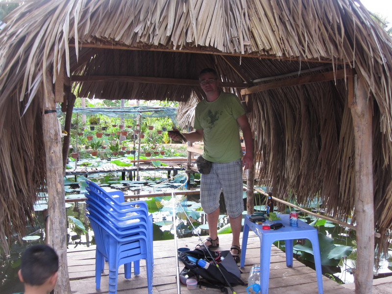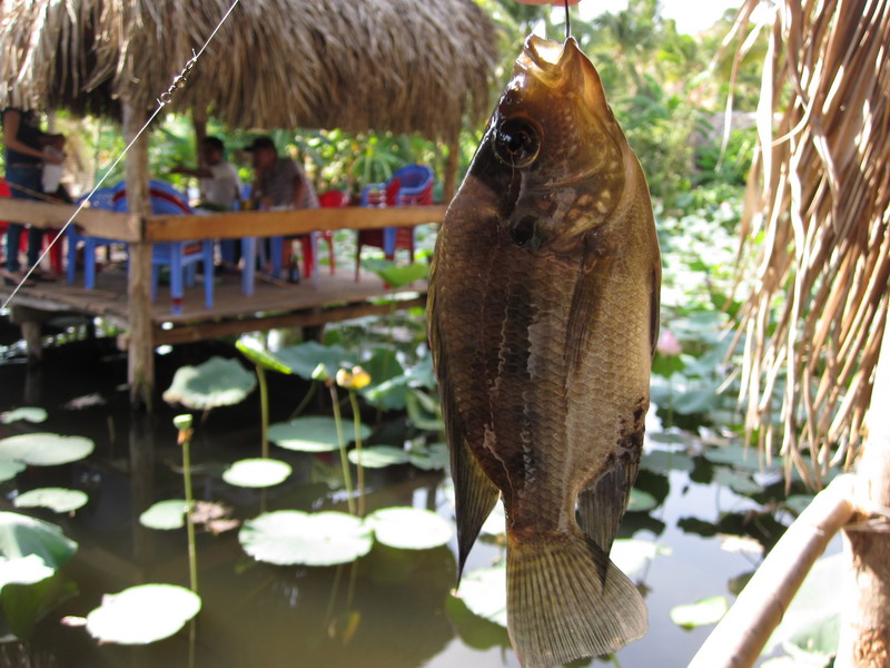 Результативнее всего вышло в кафешке у дороги, шум от мопедов не мешал. Навес, ветерок, прикорм и деликатная оснастка — темп примерно 3 кг/час на одну удочку. Крупную тилапию тут же пожарили, живую отпустили, уснувшую отдали хозяевам. На озере лотосов карп крупнее, но деликатка там не зашла. Соус к рыбе огонь, самый вкусный за поездку.