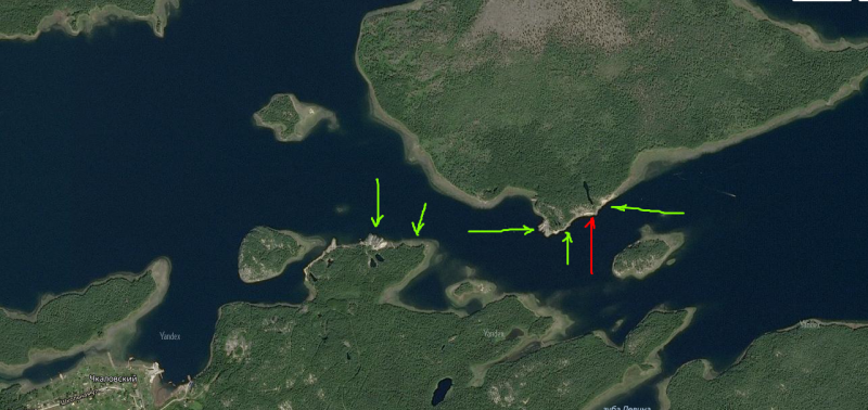 Сразу вправо от Чкаловского начинаются стоянки, рядом и на материке. Волна бывает, на байдарке далеко не уйти — ловить в окрестностях Чкаловского и Пулонги. Красным — пресняк, зелёным — стоянки.