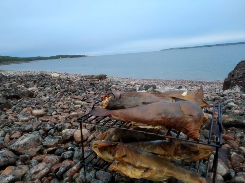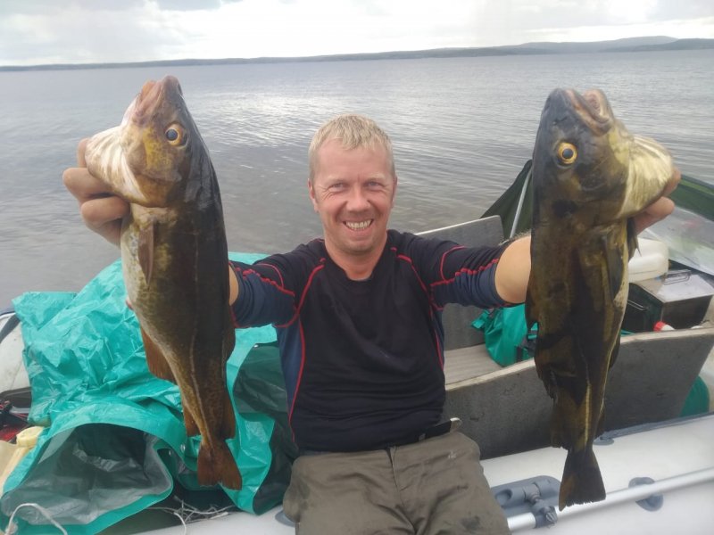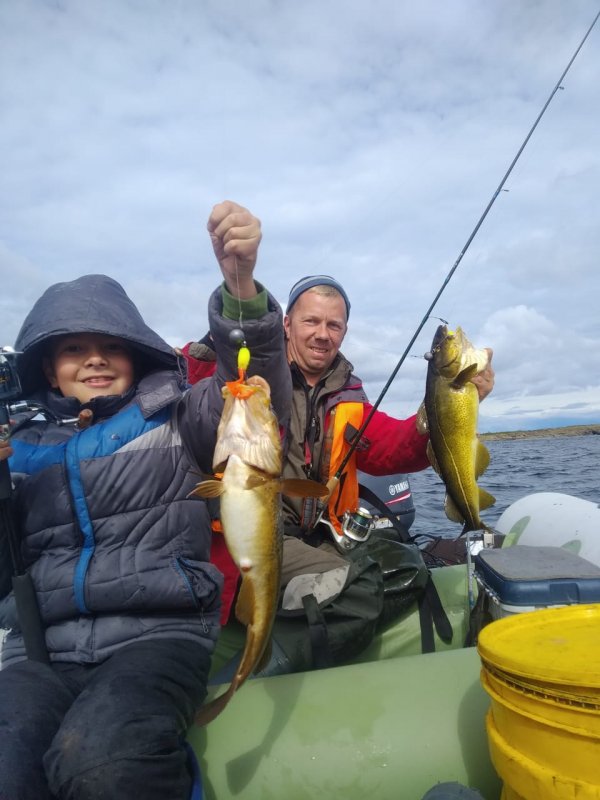 Лодку сменили на мореходнее. Западный ветер помог. На пятаке по треске стояли, трофеи отпускали — не сохранить. Дети искупались, дождь не мешал.