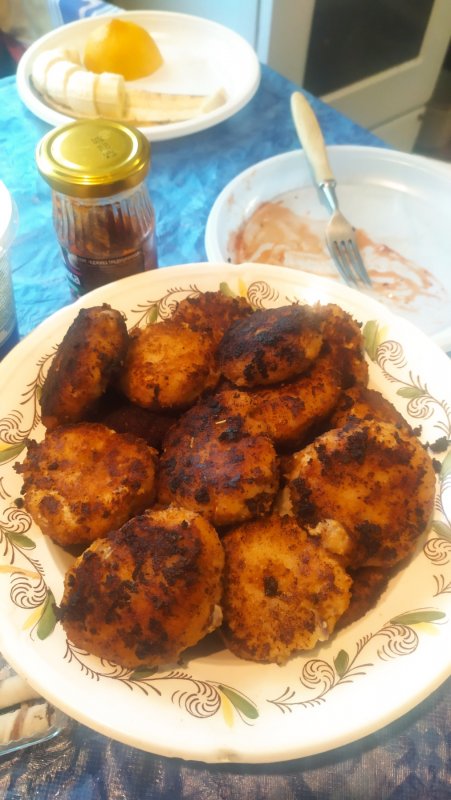 В этом году попробовали котлеты из трески. Вкусно, но Шеф повозился — в мясе трески влаги больше, чем в щуке. Фото на бегу — накинулись и вспомнили про снимок позже :)