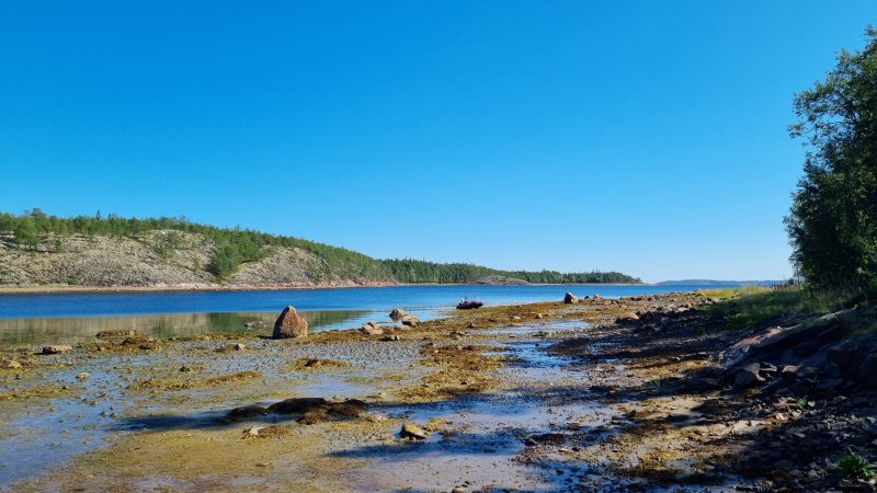 В Лодейной ближе к горлу, до ручья, изба неплохая. А у самой точки — камни и заболочено, в отлив лодку далеко тащить. Планирую корректировать место высадки.