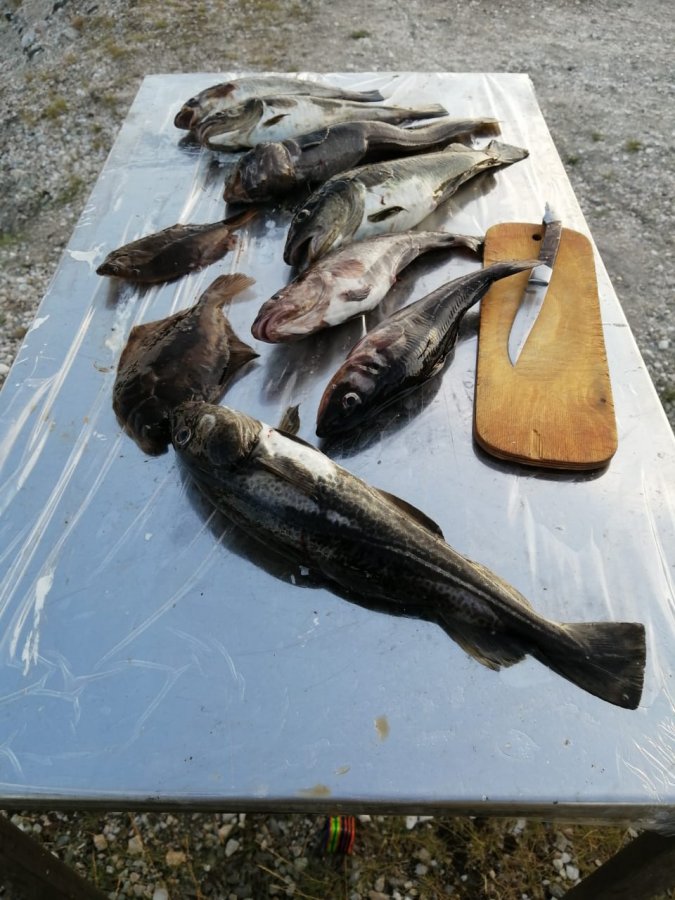Познакомились, времени мало. Клев вялый. Зубатка проскакивает, треска в основном хорошая.