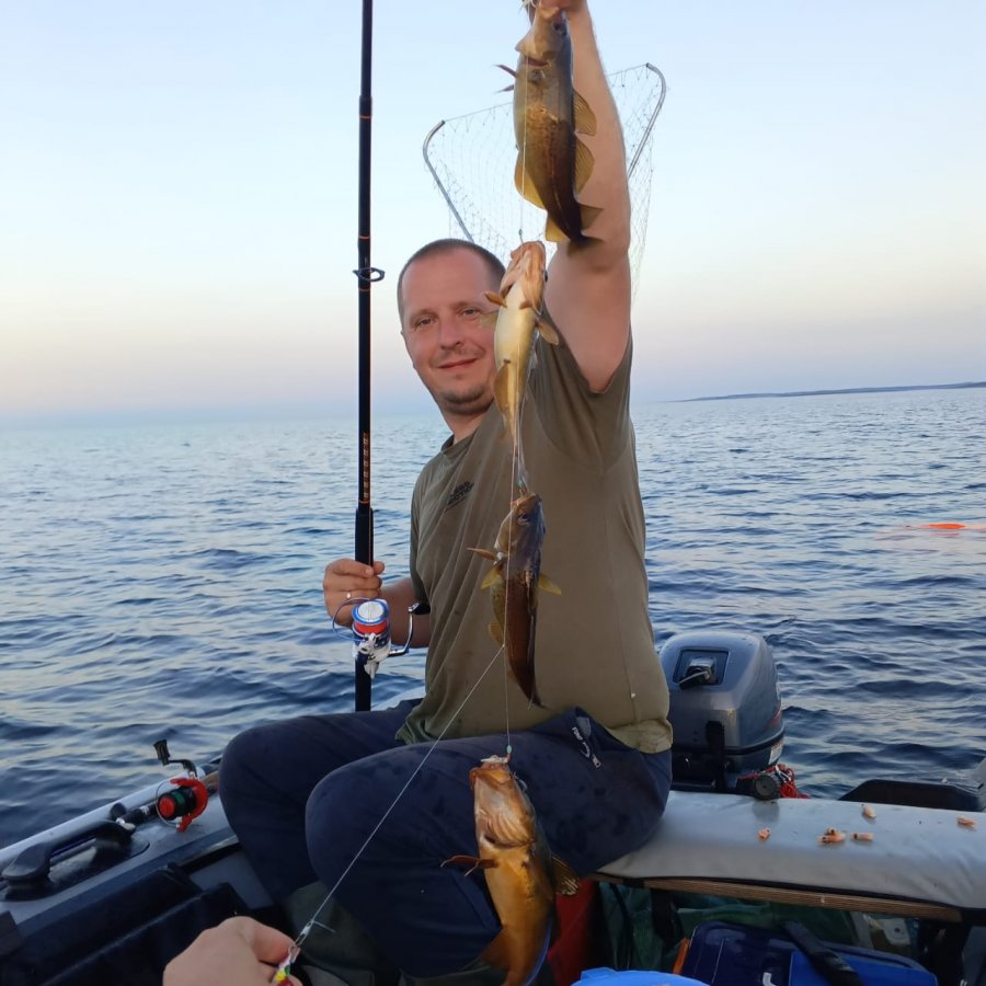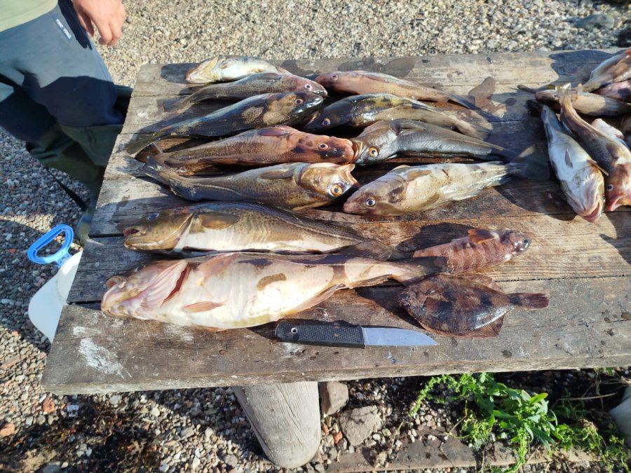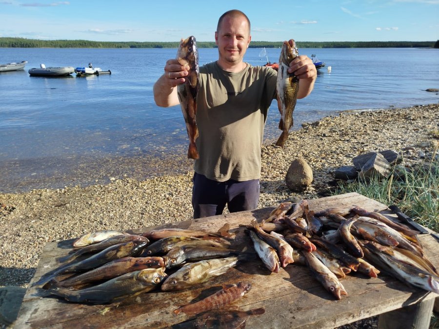 Жили у Игоря, вода тёплая, купались у пирса. Рыбалка напротив деревни слабее, поэтому ходили к Черемшихе — по ведру точно, три выезда. Дважды белухи в 20 м. Дочке 5 лет, держалась молодцом. Пилькер 60 и сверху самодур: разом вытянул 4 трески. Зубатки 3, камбала 1, селёдки не было. Коптили, жарили, домой увезли 40 л. Заезжали на Олений и каньон.