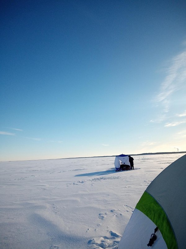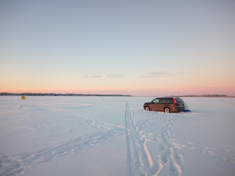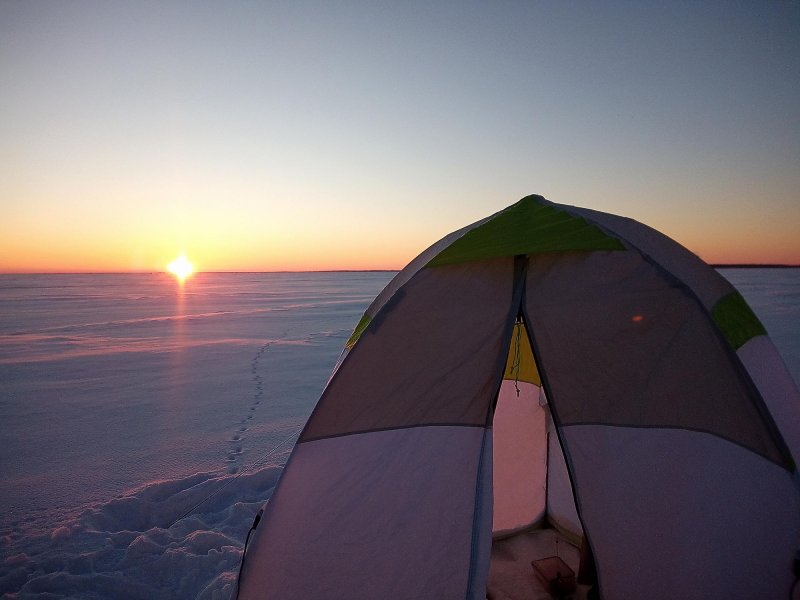 В 8 утра −36 на ветру, руки замерзают мгновенно. Ловили у маяка, 20–30 штук корюшки. Мороз жуткий, но восход красивейший. Ради этого стоило ехать!)