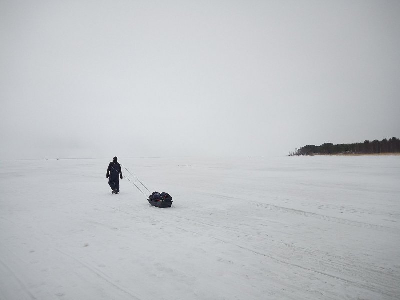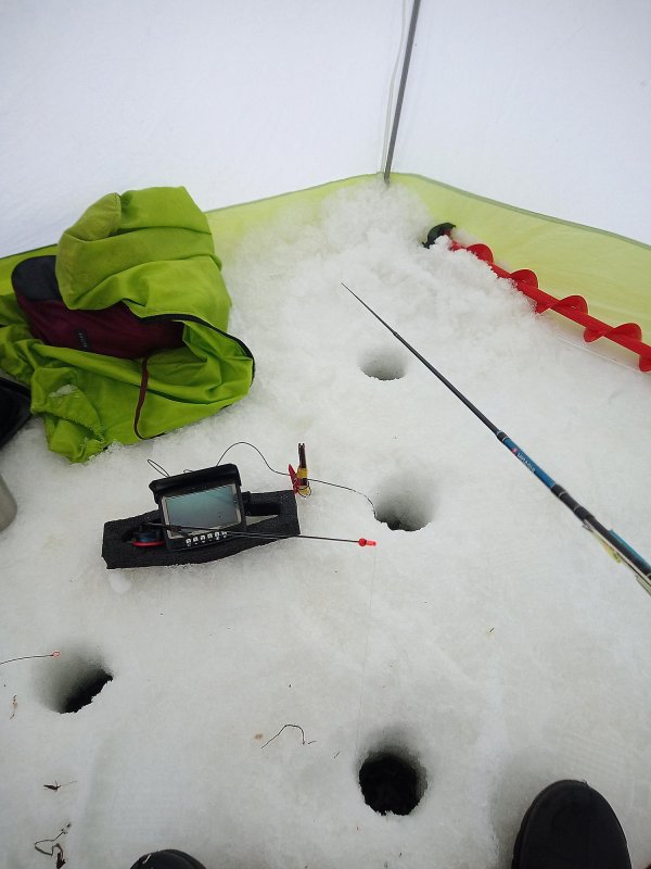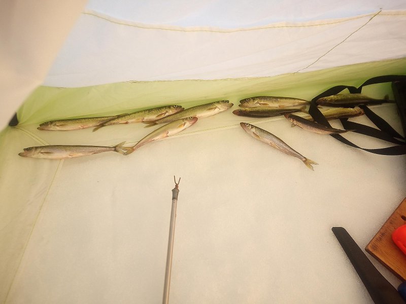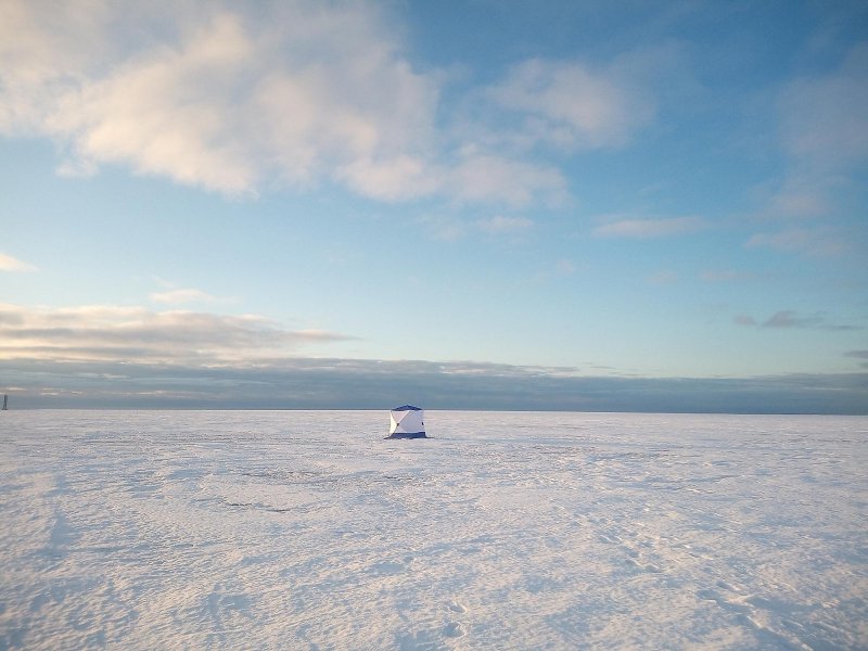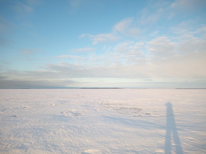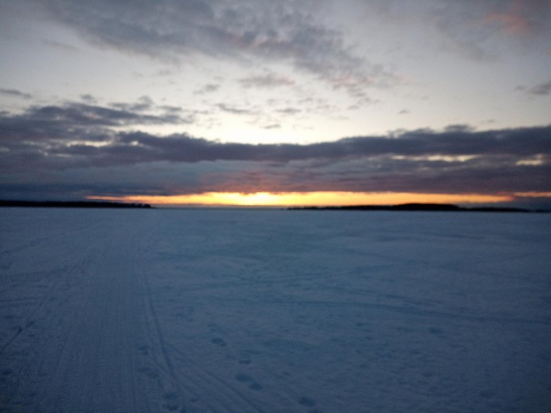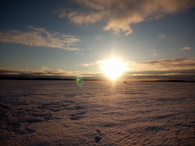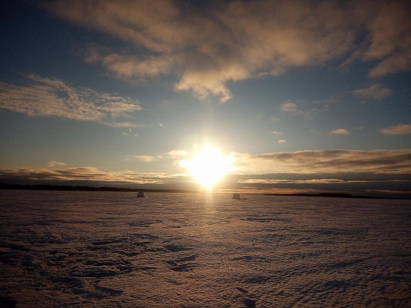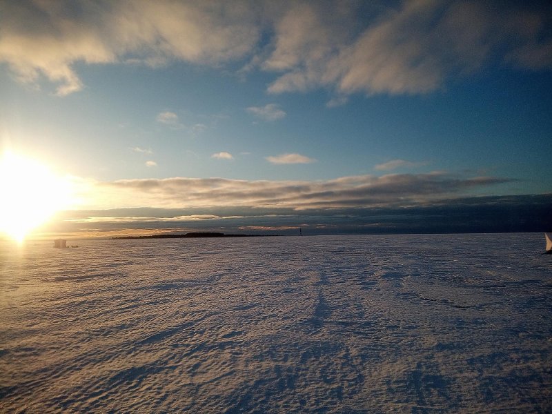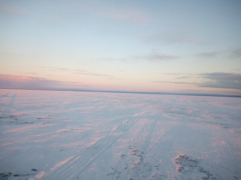 Ловили у русла, корюшка клевала плохо, зато навага пошла. К вечеру солнце, наст стал как асфальт. Закат волшебный!