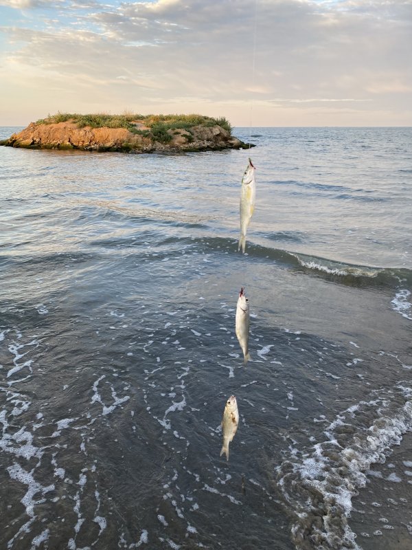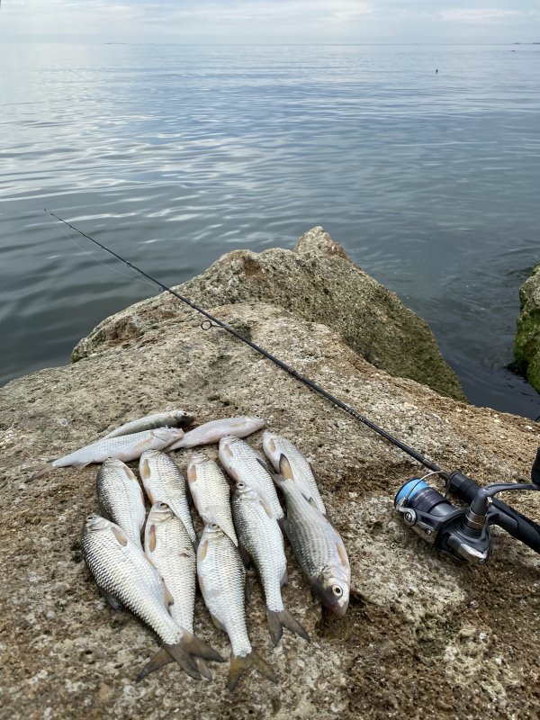 Перед поездкой искал инфу — пусто. Пляж у посёлка Рыбный. Ловил Patrol 2,13 до 8 г, катушка Daiwa 2000, плетня 0,6. Монтаж с флюром, вставка на груз — спасает от обрывов. Утром с шести до девяти тишь, каждая проводка — поклёвка. Вобла и бычок весь день. На жарёху пятнадцать штук, остальное отдал женщине с берега. Местные на червя и кукурузу, снасти потяжелее. Отличная рыбалка!)